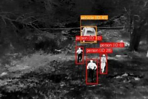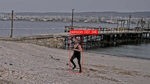 A sequence of visible ground sensor images showing the tracking of vessels and persons across different terrains, particularly "person (ID: 34)'' from the boat to the shore.