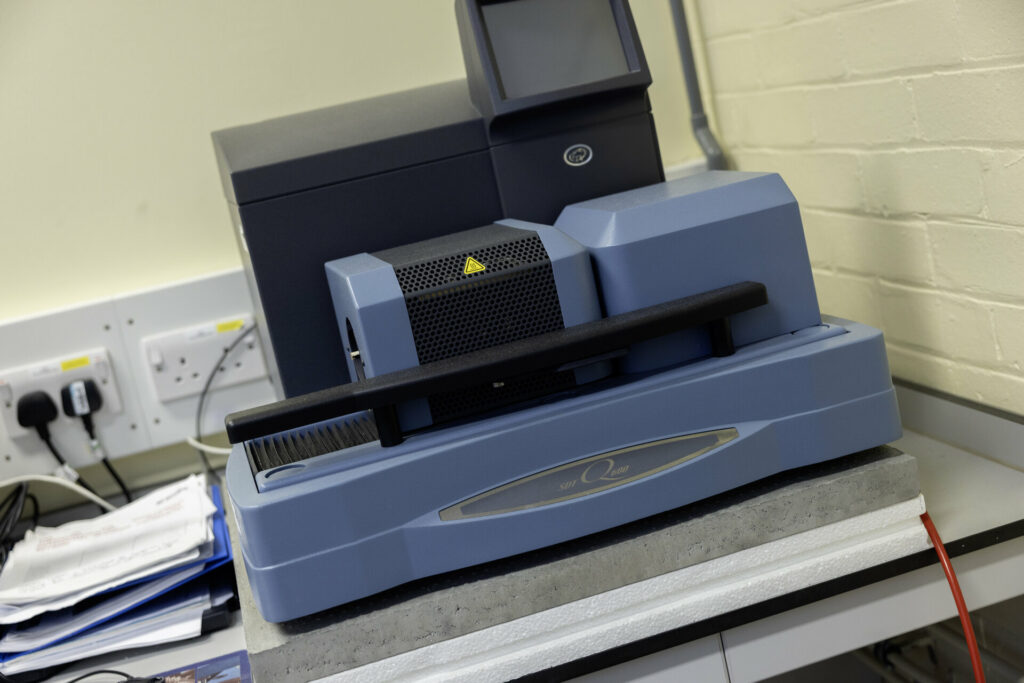 This instrument heats from room temperature to high temperatures and is ideal for analysis of inorganic samples. It provides TGA and DSC thermograms simultaneously.