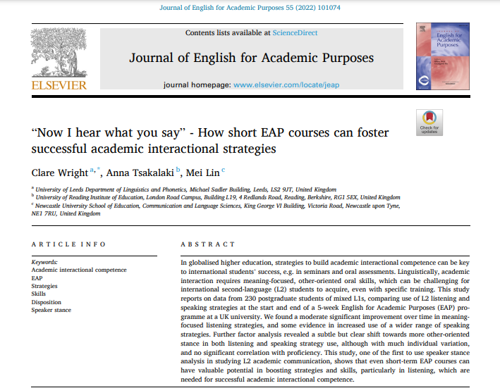 A co-authored research article, titled ‘“Now I hear what you say” – How short EAP courses can foster successful academic interactional strategies’ by Dr. Anna Tsakalaki (Lecturer in Education, University of Reading) has recently been published in Journal of English for Academic Purposes, and can be accessible free of charge here.