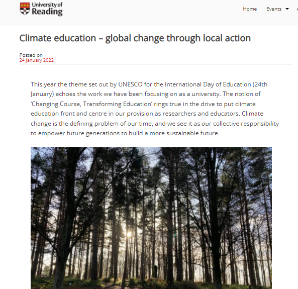 The blog post highlights the University of Reading’s Climate Education Summit and what it has achieved to build momentum for Climate Education in England. The blog post also discusses the importance of working collaboratively to support the development of climate education across all aspects of life. The blog post was published on UNESCO’s International Day of Education. The theme for this year was ’Changing Courses’ Transforming Education’. The day set out to highlight the need to embed climate education in school globally. Therefore, to achieve this we must take local action to achieve the ambitious global change. This includes embedding climate education within all Initial Teacher Training courses, as set out in the National Climate Action Plan.