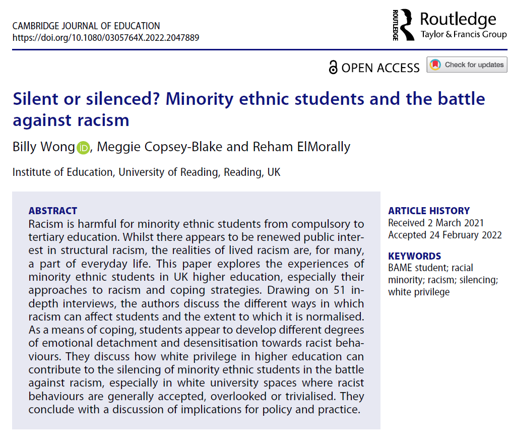 Wong, B., Copsey-Blake, M., & ElMorally, R. (2022). Silent or silenced? Minority ethnic students and the battle against racism. Cambridge Journal of Education. https://doi.org/10.1080/0305764X.2022.2047889