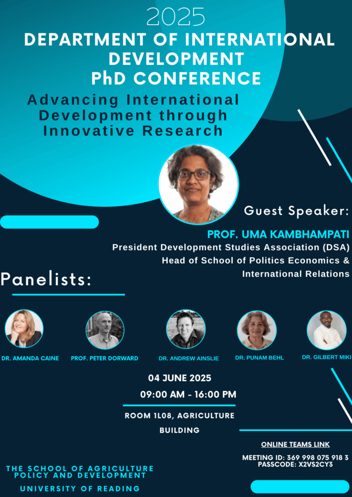 On behalf of the School of Agriculture, Policy and Development at the University of Reading, we are pleased to invite you to our upcoming Postgraduate Research Conference organised by the Department of International Development, taking place on Wednesday, 4th June 2024, from 9:00 AM to 4:00 PM BST. You are welcome to attend either in person or online via the Microsoft Teams link provided below.