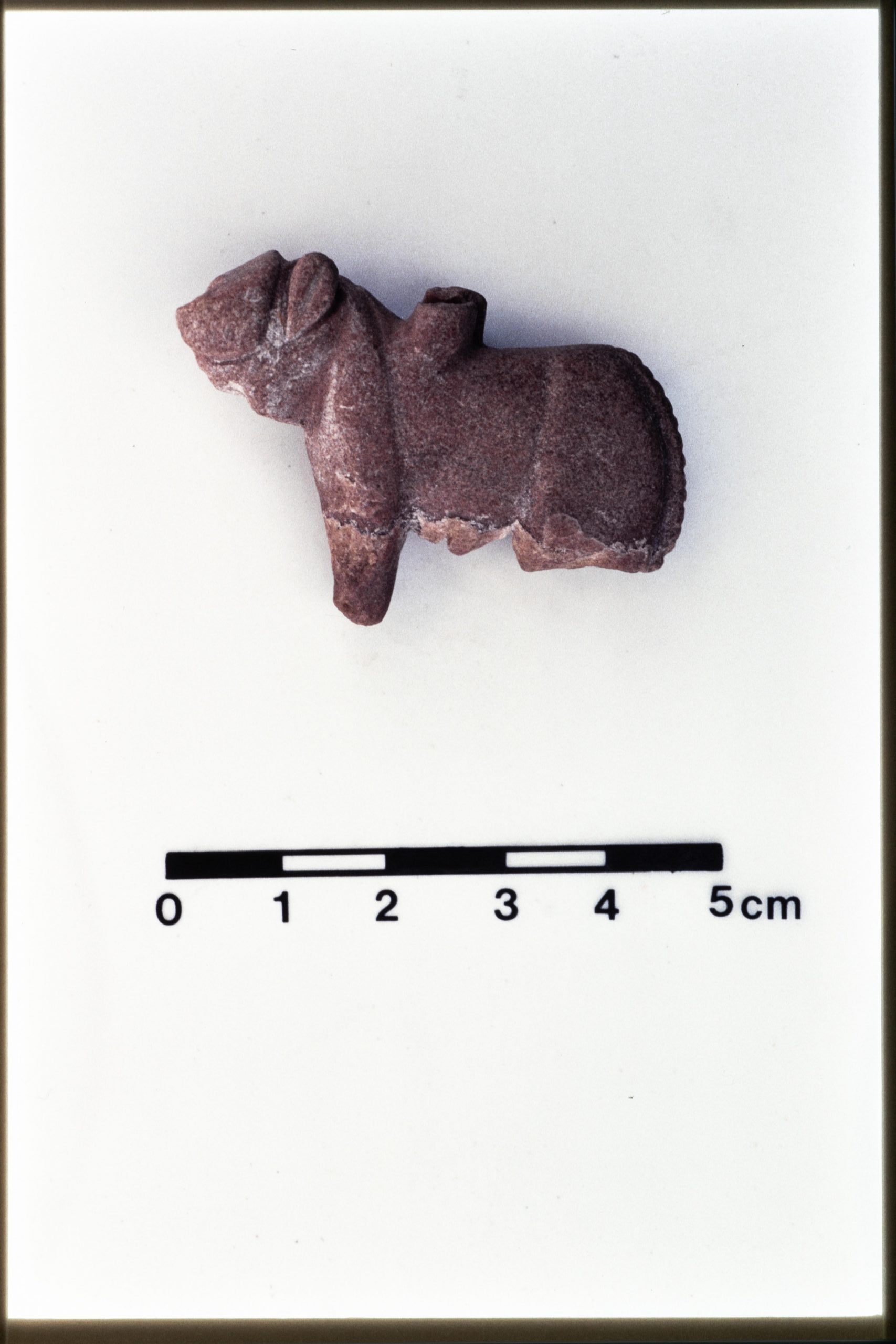 JN20_01 – Mound B. Stone bull pendant. 4CS:17 (JN 641). 4C56 surface. H. 3.5 cm. L. 4.3 cm. W. 1.1 cm. Pink carved stone. Suspension loop on back broken at top. Rear leg missing, face chipped.
