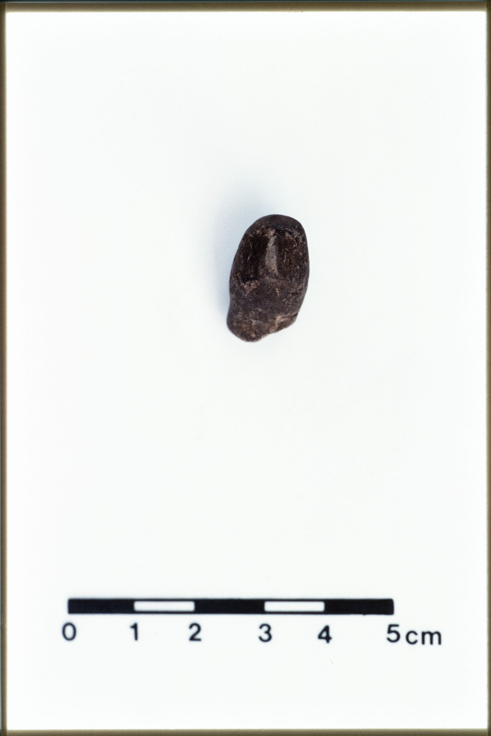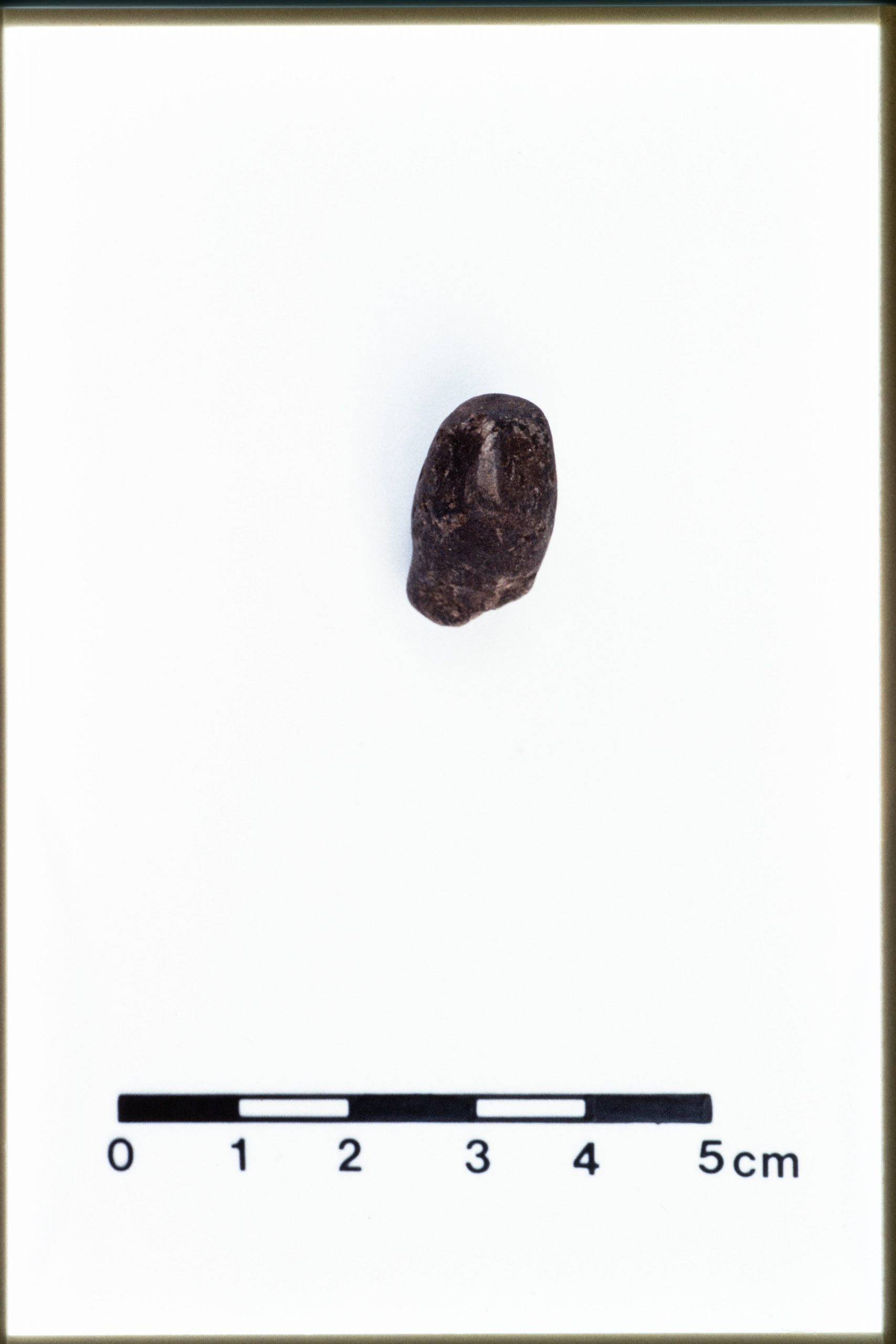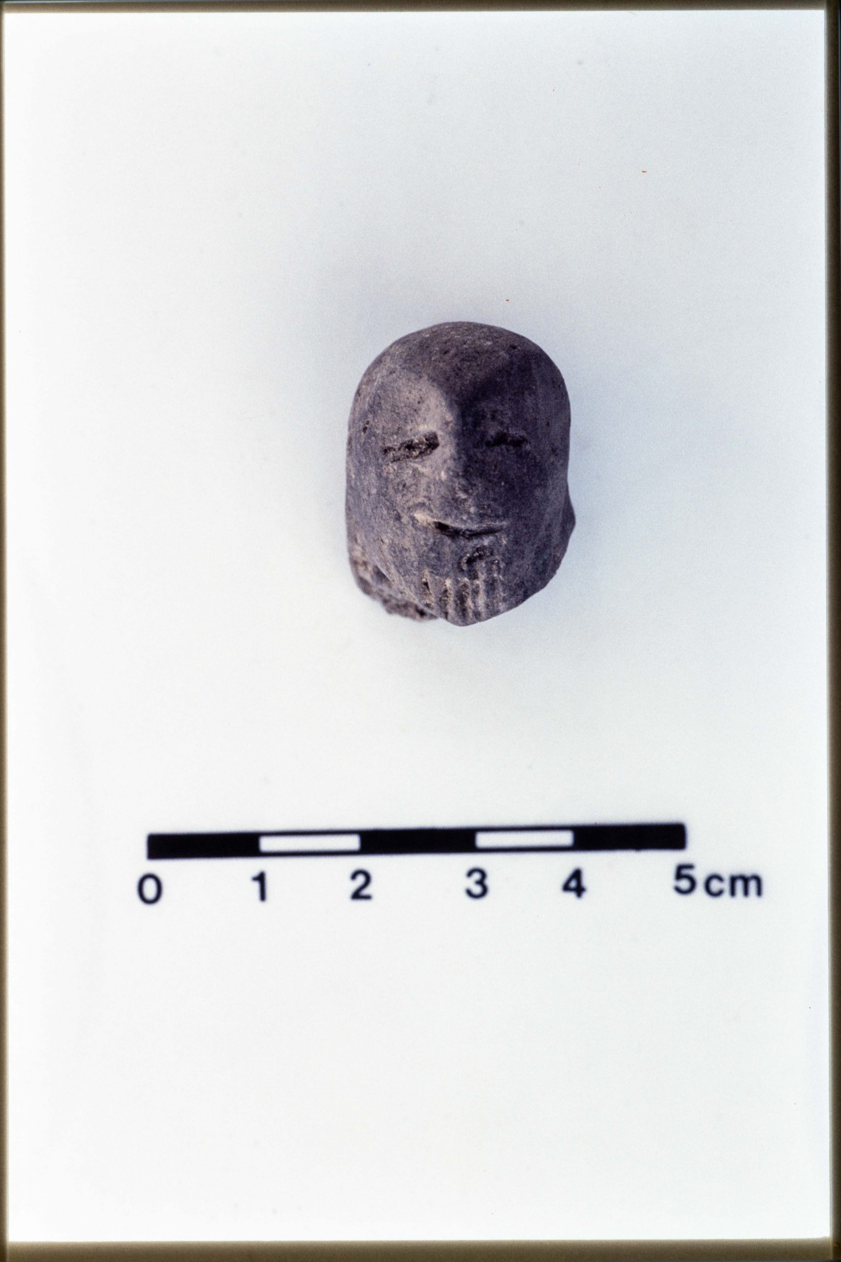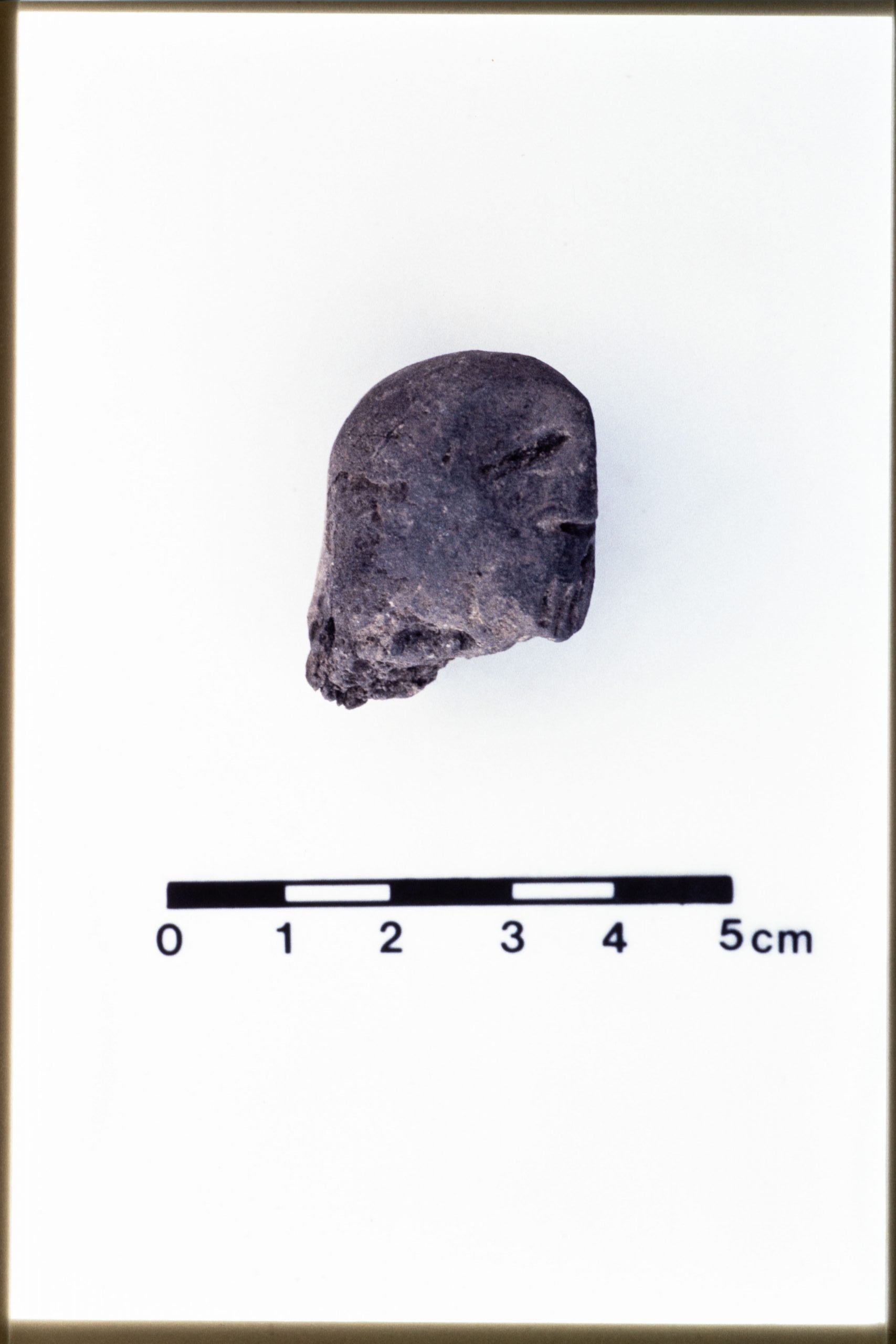 JN20_02 – Mound B. Figurine. 4C77:160 (JN 645). 4C77 dump. Dimensions 3.4 x 2.5 x 2.2 cm. Unbaked dark grey clay. Human head with pitched nose, incised eyes, mouth and beard.