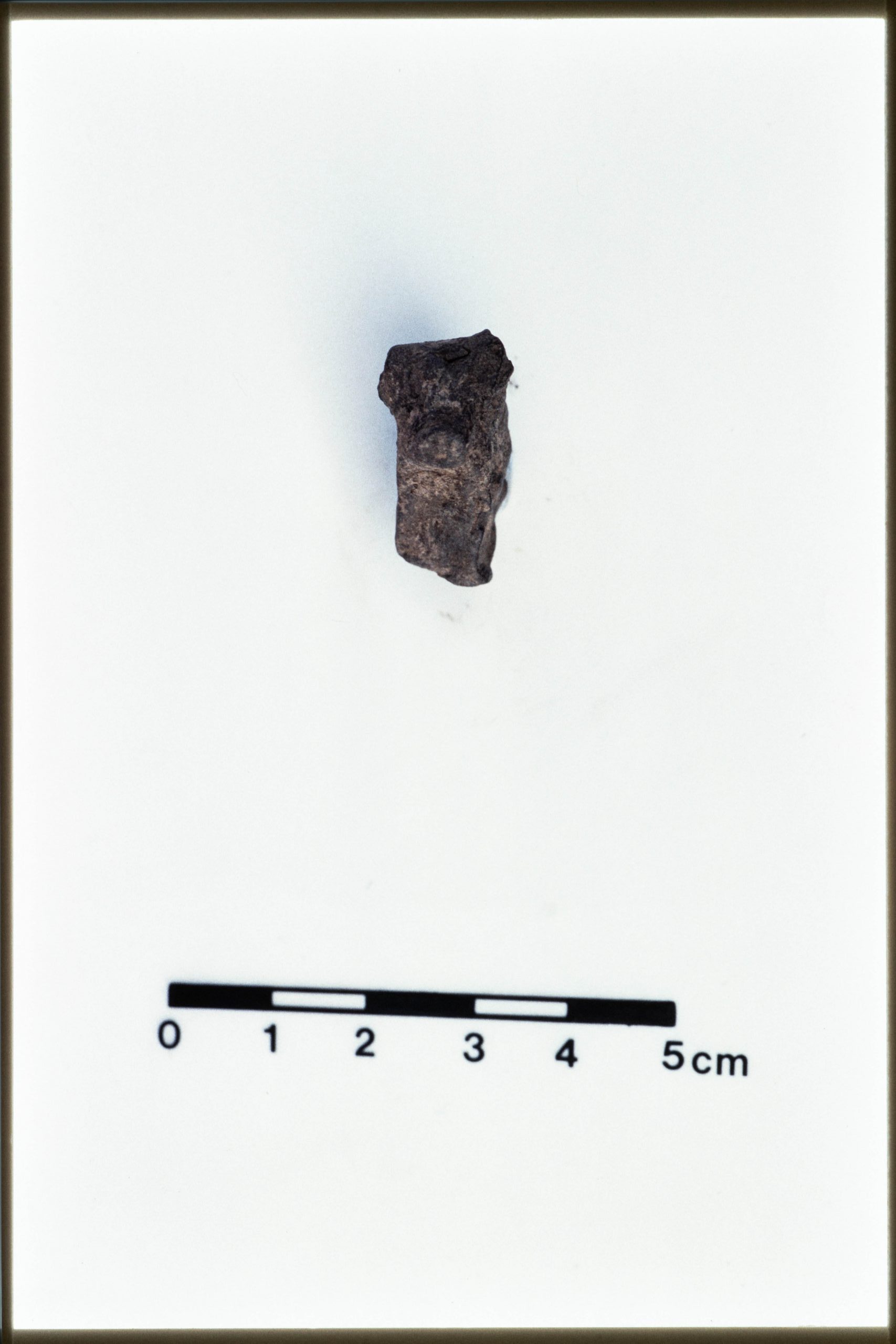 JN20_14 – Mound B. Figurine. 4C77:175 (JN 597). 4C77 dump. Dimensions 2.5 x 1.4 x 1.4 cm. Unbaked dark brown clay. Front end of pig figurine, with snout and part of front legs. Ears and body broken.