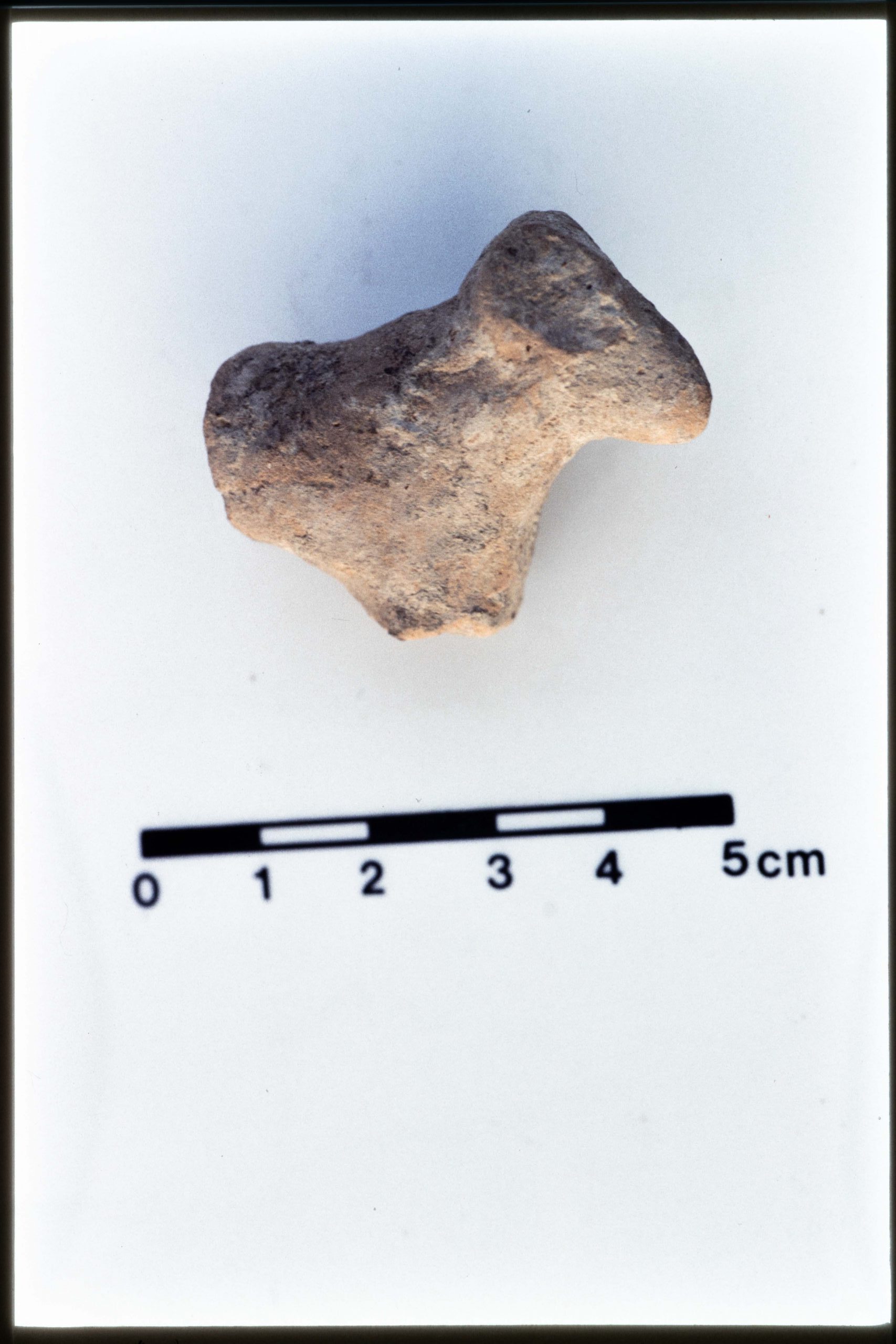 JN20_15 – Mound B. Figurine. 4C77:247 (JN 598). 4C77 dump. Dimensions 3.5 x 3.5 x 1.7 cm. Unbaked orange clay. Front part of ?ram figurine. Horns, body and legs missing.