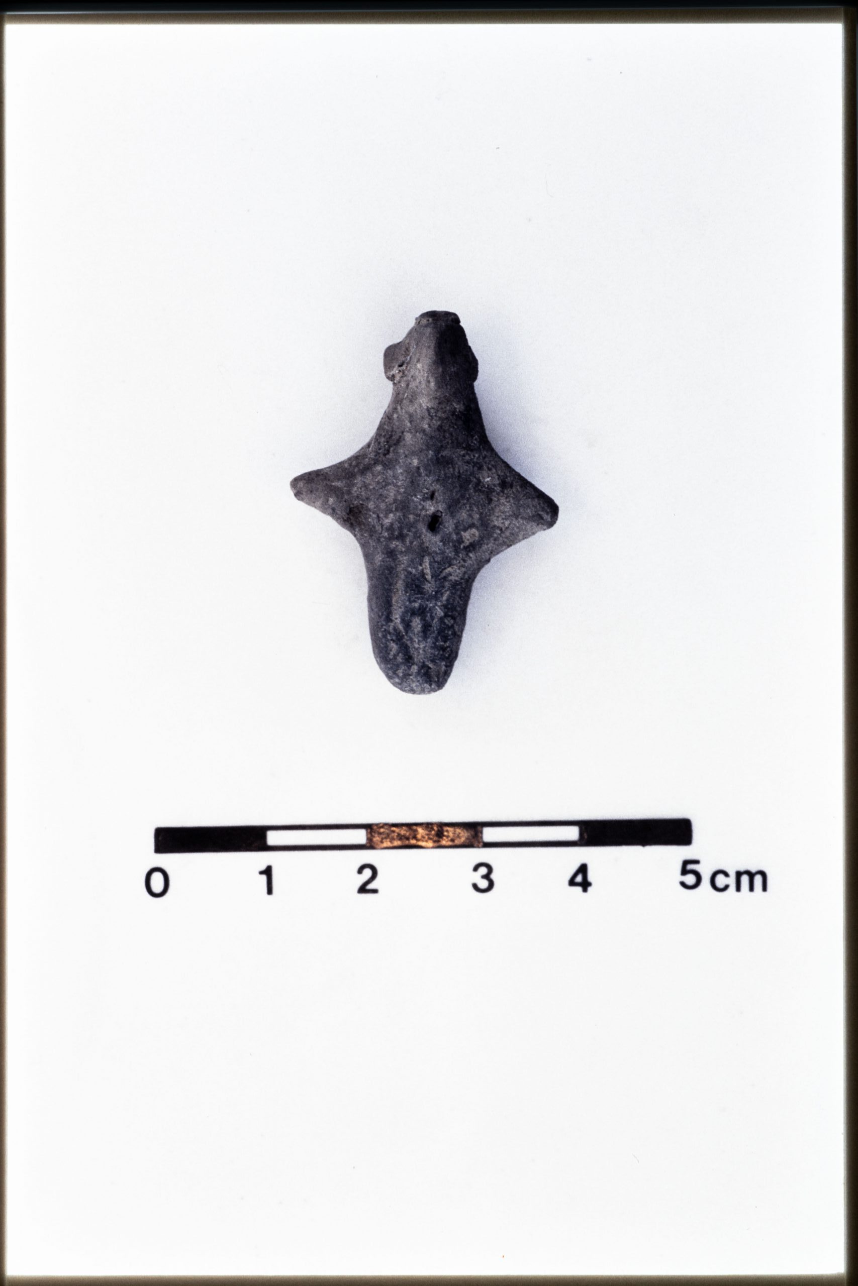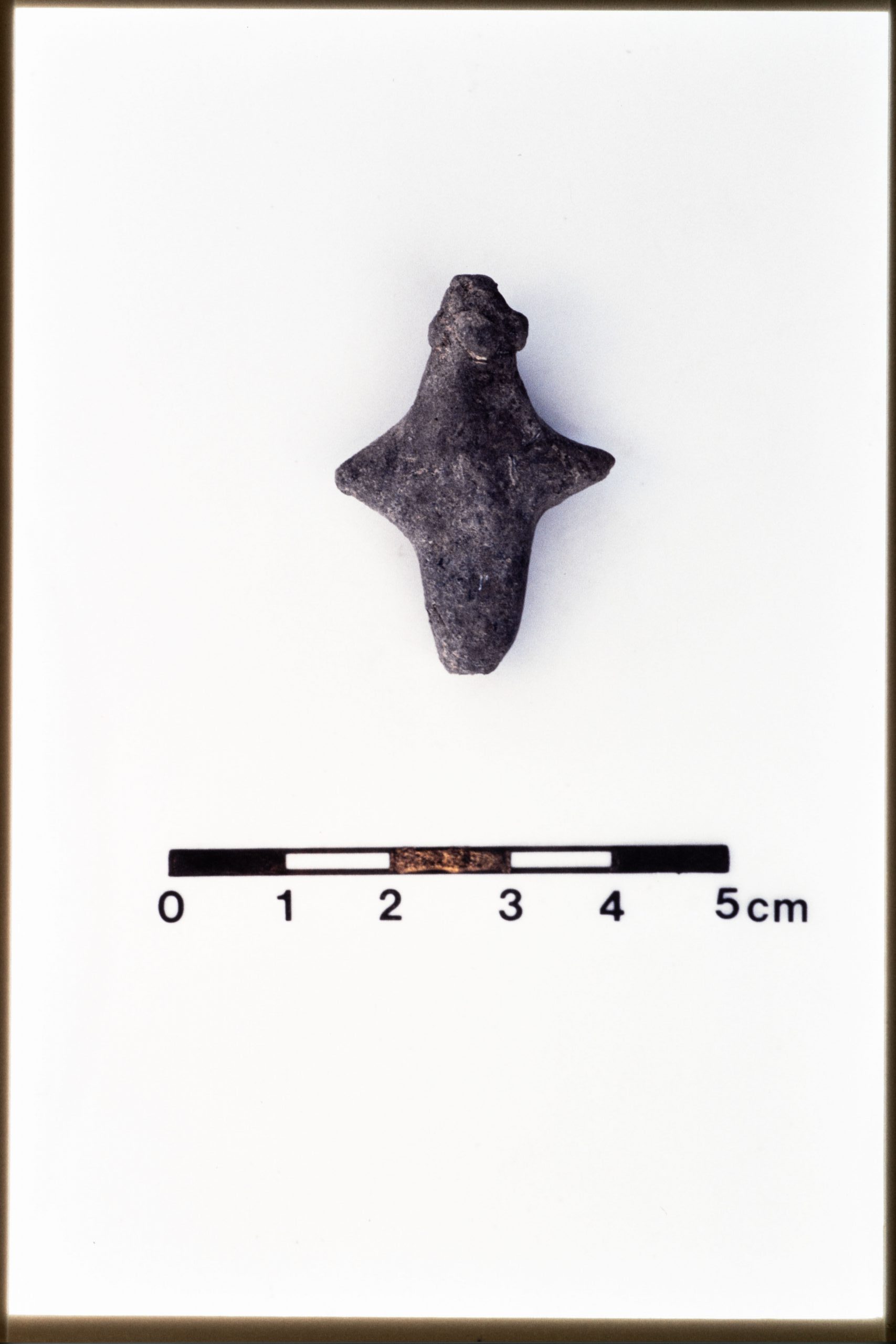 JN20_21 – Mound B. Figurine. 4C88:23 (JN 647). 4C88 dump. Dimensions 3.5 x 2.4 x 1.1 cm. Unbaked grey/brown clay. Stylized human figurine with applied blobs for ears and ?hair.