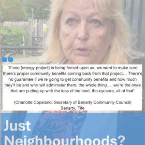 “If one’s [energy project] being forced upon us, we want to make sure there’s proper community benefits coming back from that project… There’s no guarantee if we’re going to get community benefits and how much they’ll be and who will administer them, the whole thing… We need to agree what the figure is and it needs to be set in stone… It needs to come to the local community because we’re the ones that are putting up with the loss of the land, the eyesore, all of that”