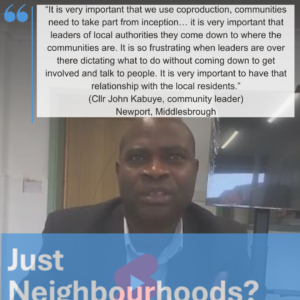 “When we plan projects and want to achieve success in whatever we do it is very important that we use coproduction, communities need to take part from inception… it is very important that leaders of local authorities they come down to where the communities are. It is so frustrating when leaders are over there dictating what to do without coming down to get involved and talk to people. It is very important to have that relationship with the local residents”