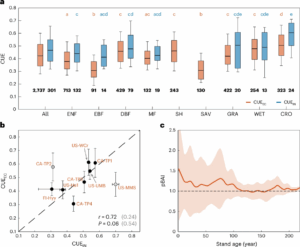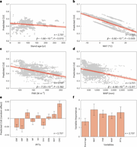 - Stand Age: Older ecosystems tend to have lower CUE, highlighting the importance of ecosystem development and successional dynamics.