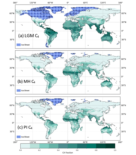 Tree cover was dramatically reduced. C4 plants (typically grasses thriving in high-light, low-CO2, or dry conditions) nearly doubled in abundance, accounting for 40% of the vegetation fraction and 56% of total GPP. This aligns with evidence from pollen and leaf wax biomarkers, which show that C4 grasses were more widespread during the glacial period.