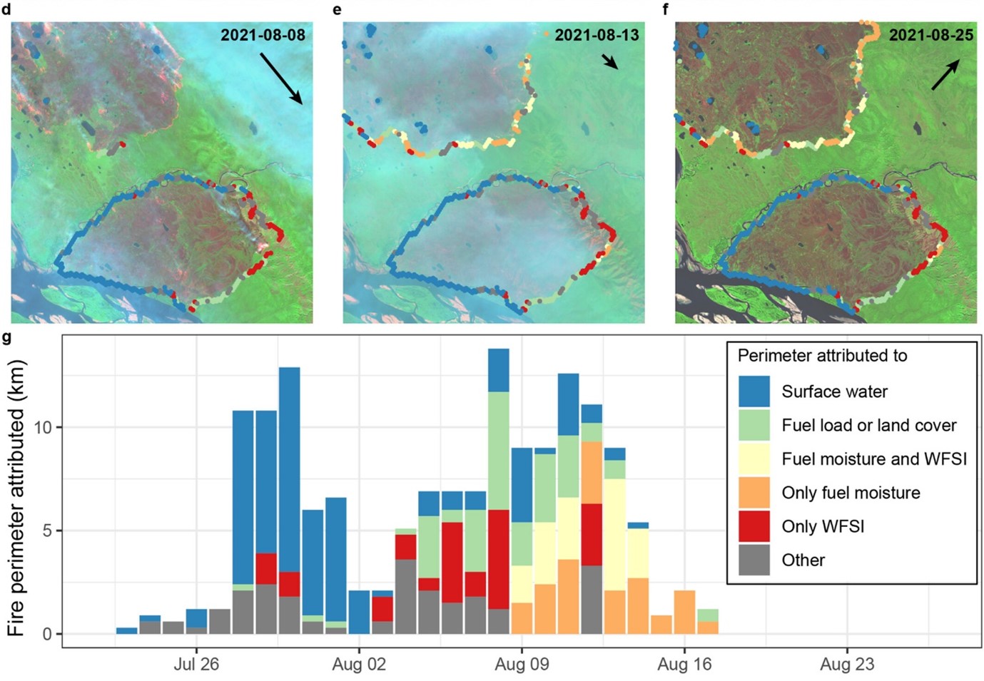 One particularly interesting question Sander addressed was why these fires eventually go out. To understand how boreal fires spread in the future, it is crucial to examine the limits to their growth. A paper published in 2025 by Sander’s group investigates this question by analyzing fire perimeters to determine what halts fire spread. Their findings show that changes in fire drivers (e.g. landscape cover, infrastructure, or water bodies) constrain fires either in space or in time. Weather changes define the temporal constraints, while landscape features impose spatial limits. This snippet of Figure 4 from Janssen and Veraverbeke (2025) shows the different drivers of fire that caused the halting of one fire in these Arctic-Boreal Regions.
