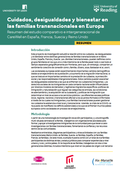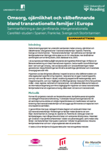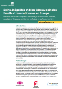 We are pleased to announce that the executive summaries of the Final Report of our research project, Care, Inequalities, and Wellbeing in Transnational Families in Europe are available to download here in Swedish, French and Spanish. The research project was a collaboration between the University of Reading, the University of Leeds in the UK, Malmö University in Sweden, Aix-Marseille University in France and University of A Coruña in Spain.